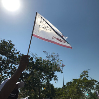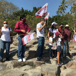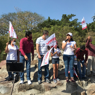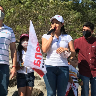 Arropada por su esposo, hija e hijo, Sergio Jiménez Bojado, presidente de Morena e Hipean Maya, delegado de este partido en la entidad, la candidata dirigió un mensaje hacia aproximadamente 150 personas, que aguantaron el sol a plomo de las 15:30 horas, en este emblemático parque de la ciudad de Colima.